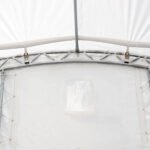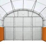 Made of strong, heavy-duty commercial grade polyvinyl chloride (PVC) fabric that is triple layered to prevent tearing and provide a long-lasting shelter covering for many years. This fabric is a natural flame retardant, commonly used in large commercial structures such as sports stadiums and event halls. The enclosed end wall and front drop provide an extra layer of protection for your machinery and weather sensitive cargo. Endwall is designed for standard 40′ GP containers; a 14″ base will need to be added if using HC containers.