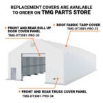 The TMG-DT3081-PRO PVC Fabric Peak Ceiling Storage Shelter provides an easy to assemble, durable outdoor storage solution or workshop for your farm, construction site, equipment dealership and more. Approximately 2400 square feet of covered space to stockpile materials, work on projects, park vehicles and accommodate all other needs big or small. Able to install on any concrete pad or equivalent for versatile useability whether you’re working in remote, rural or industrial locations.
